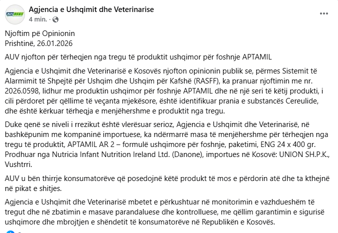 Agjencia e Ushqimit dhe Veterinarisë e Kosovës (AUV) ka njoftuar tërheqjen e menjëhershme nga tregu të produktit ushqimor për foshnje APTAMIL AR 2 – formulë ushqimore për foshnje, paketimi ENG 24 x 400 gramë, pas identifikimit të një rreziku serioz për shëndetin.