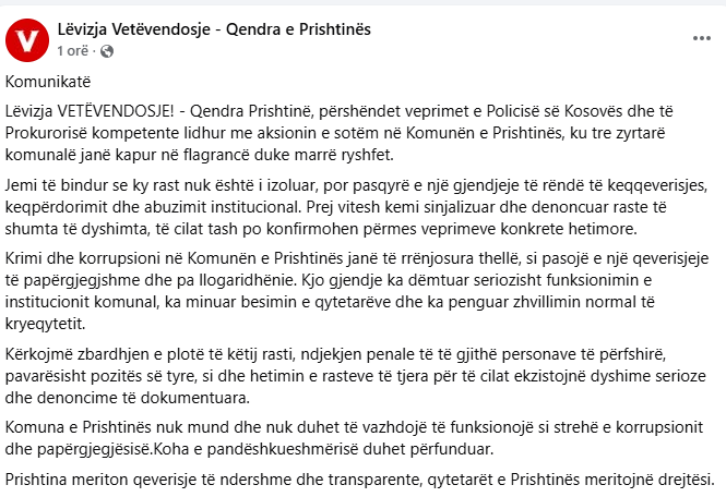 Lëvizja Vetëvendosje reagoi pas arrestimit të tre zyrtarëve të Komunës së Prishtinës për dyshim ryshfeti, duke theksuar se krimi dhe korrupsioni në këtë komunë janë të thellë dhe të rrënjosura.
