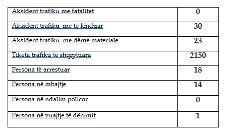 Po ashtu, gjatë kësaj kohe janë regjistruar gjithsej 53 aksidente trafiku, prej të cilave 30 aksidente kanë rezultuar me persona të lënduar, ndërsa 23 aksidente kanë shkaktuar vetëm dëme materiale.