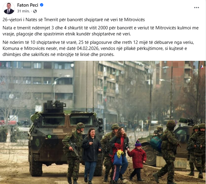 Kryetari i Mitrovicës së Jugut, Faton Peci, ka kujtuar 26-vjetorin e Natës së Tmerrit për shqiptarët në veri të Mitrovicës.
