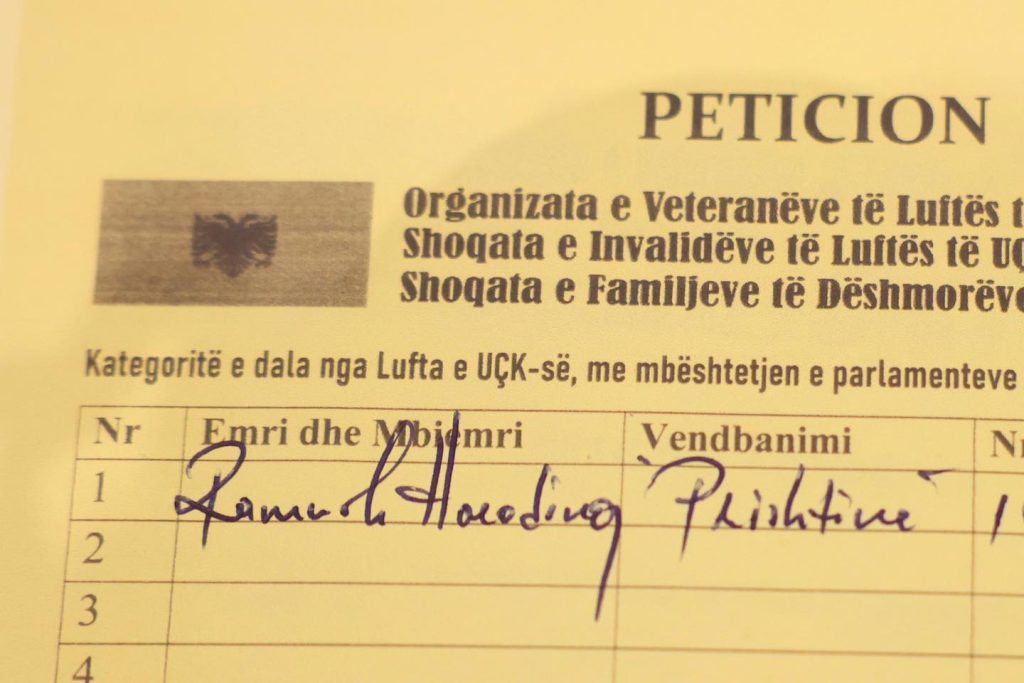 Ish-kryeministri Ramush Haradinaj ka nënshkruar sot një peticion kombëtar në përkrahje të bashkëluftëtarëve të tij që po përballen me gjykimin në Gjykatën Speciale në Hagë.